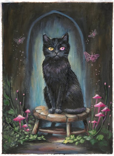 The cat sits where the veil grows thin,