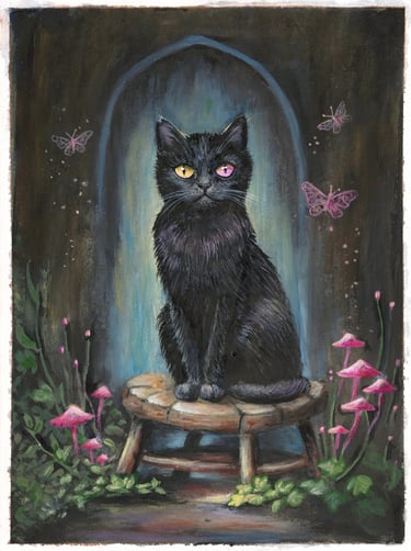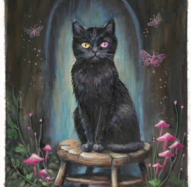 The cat sits where the veil grows thin,
